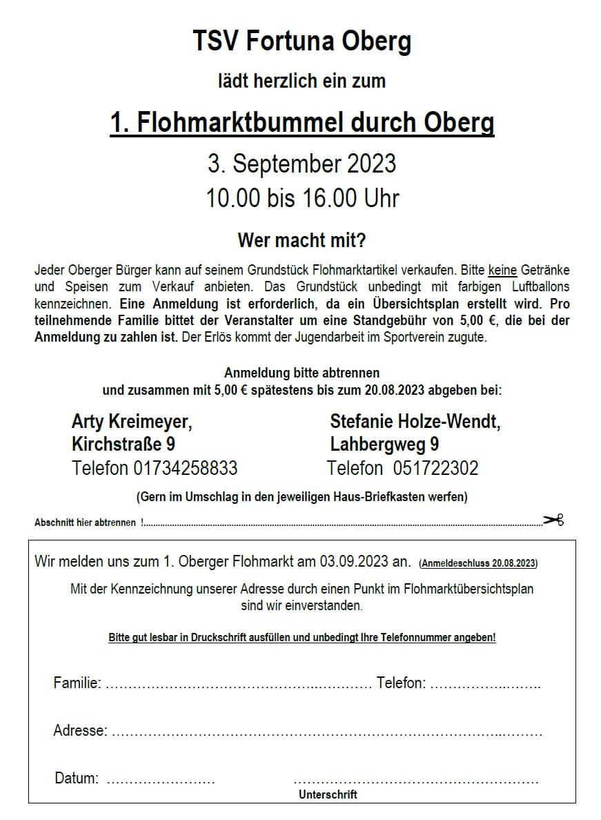 Jeder Oberger Bürger kann auf seinem Grundstück Flohmarktartikel verkaufen. Eine Anmeldung ist erforderlich, da ein Übersichtsplan erstellt wird. Pro teilnehmender Familie bittet der Veranstalter um eine Standgebühr von 5, die bei der Anmeldung zu bezahlen sind. Der Erlös kommt der Jugendarbeit im Sportverein zugute.