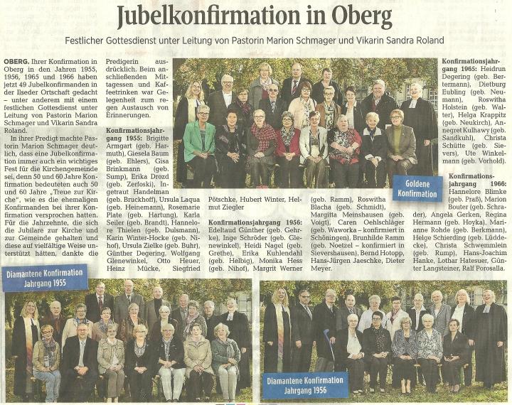 Über insgesamt 49 Jubelkonfirmanden in Oberg am 23. Oktober berichtet die PAZ vom 5. November 2016. Namentlich erwähnt und geehrt wurden die diamantenen Konfirmanden der Jahrgänge 1955 und 1956, sowie die goldenen Konfirmanden der Jahrgangs 1965 und 1966.