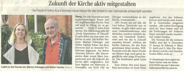 Am Freitag, den 26. Februar 2016 berichtet die PAZ über den Fresh-X-Intro-Kurs der Kirchengemeinde Oberg. Nach dem Start am 11. November 2015 (siehe weiter unten) hat sich die aus bis zu zwölf Teilnehmern bestehende Gruppe bereits zweimal getroffen, um neue Ideen für eine aktive Mitgestaltung der Zukunft der Kirche zu finden. Dieser Artikel ist auch