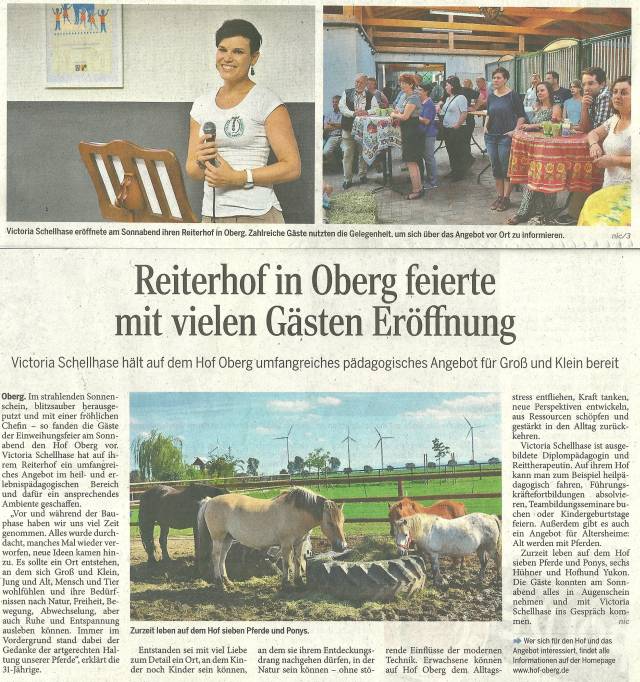 Auf Hof Oberg, Im Schwarzen Kamp 45, bietet Victoria Schellhase ca. seit Anfang Juni 2015 heilpädagogisches / therapeutisches Reiten und Fahren, Projekte für Kindergärten und Schulen, Wochenend- und Ferienbetreuung und vieles mehr.