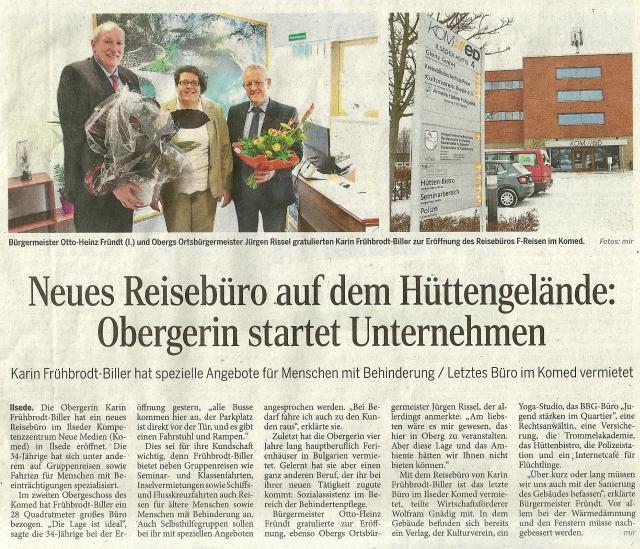 Am Montag, den 4. Januar 2016 eröffnete die Obergerin Karin Frühbrodt-Biller im Ilseder KOMED ein Reisebüro, dass u.a. sich auf Gruppenreisen für Menschen mit Beeinträchtigungen spezialisiert hat. Den Bericht aus der PAZ vom 5. Januar kann man auch