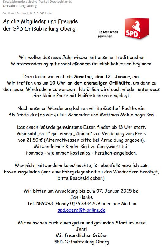Anschliessend treffen sich um 13 Uhr alle im Gasthof Radtke zu einer Portion Grünkohl "satt". Jan Hanke bittet um vorherige Anmeldung bis zum 7. Januar.