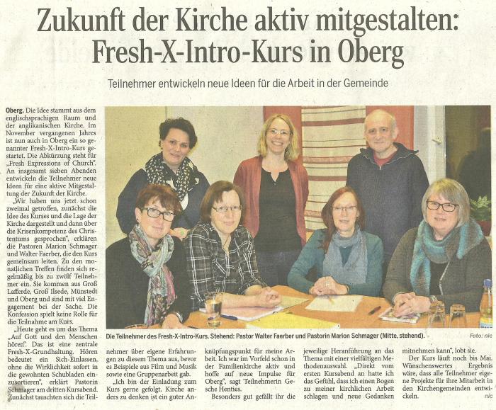 Am Freitag, den 26. Februar 2016 berichtet die PAZ über den Fresh-X-Intro-Kurs der Kirchengemeinde Oberg. Nach dem Start am 11. November 2015 (siehe weiter unten) hat sich die aus bis zu zwölf Teilnehmern bestehende Gruppe bereits zweimal getroffen, um neue Ideen für eine aktive Mitgestaltung der Zukunft der Kirche zu finden. Dieser Artikel ist auch